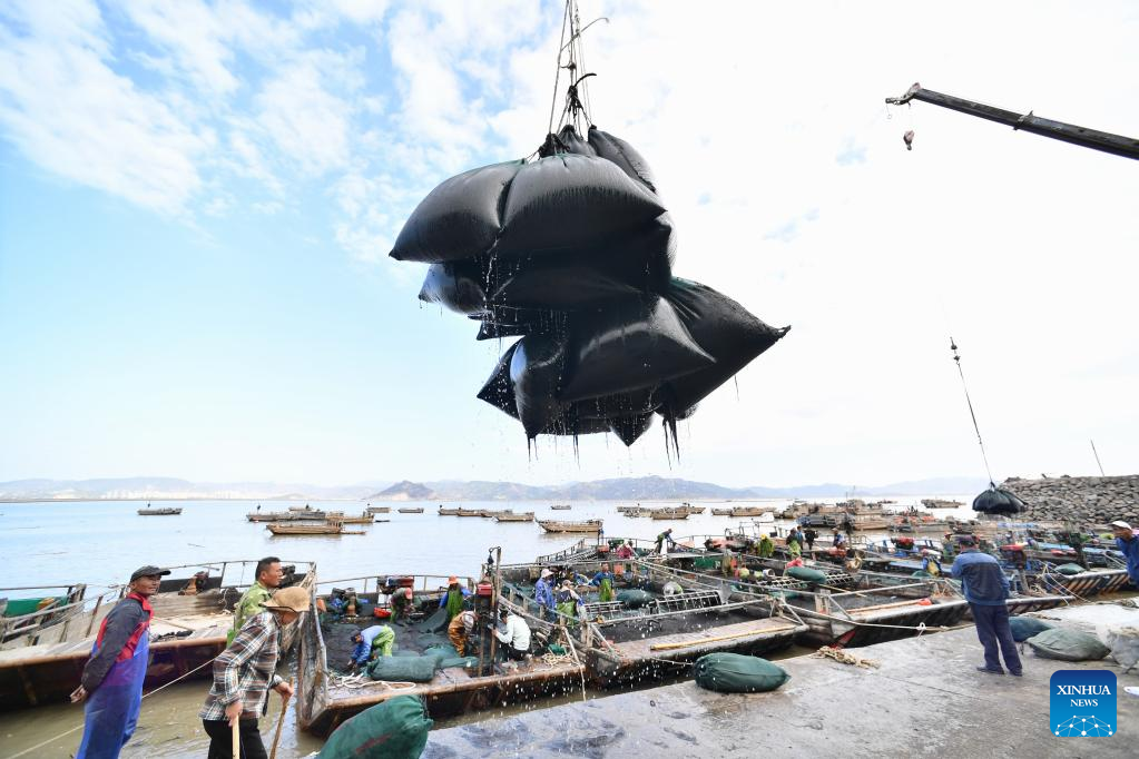 Staff members lift newly harvested laver at a port of Shatangjie Village, Songshan Sub-district, Xiapu County of southeast China's Fujian Province, Oct. 21, 2022. Known as zicai in Chinese, gim in Korean, and nori in Japanese, laver is an edible seaweed that plays an important part in the diets of East Asian countries. As one of the amplest source of laver products in the country, Xiapu boasts a vast area of seaborne farms for such seaweed, whose breeding, growing, and processing has become a leading cash cow for the locals. (Xinhua/Jiang Kehong)