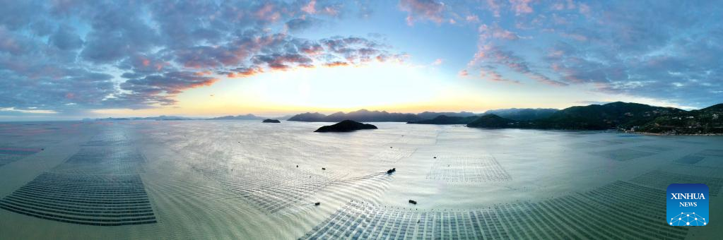 This aerial photo taken on Oct. 20, 2022 shows a seaborne laver farm at Sansha Town, Xiapu County of southeast China's Fujian Province. Known as zicai in Chinese, gim in Korean, and nori in Japanese, laver is an edible seaweed that plays an important part in the diets of East Asian countries. As one of the amplest source of laver products in the country, Xiapu boasts a vast area of seaborne farms for such seaweed, whose breeding, growing, and processing has become a leading cash cow for the locals. (Xinhua/Jiang Kehong)