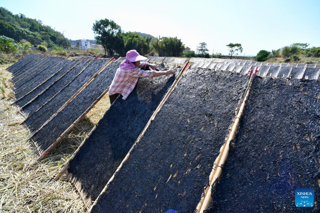 A fisher airs newly harvested laver at Sansha Town, Xiapu County of southeast China's Fujian Province, on Oct. 21, 2022. Known as zicai in Chinese, gim in Korean, and nori in Japanese, laver is an edible seaweed that plays an important part in the diets of East Asian countries. As one of the amplest source of laver products in the country, Xiapu boasts a vast area of seaborne farms for such seaweed, whose breeding, growing, and processing has become a leading cash cow for the locals. (Xinhua/Jiang Kehong)