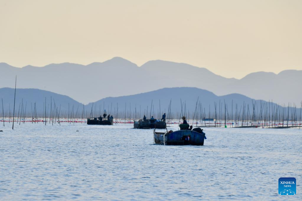 Fishers aboard boats approach a seaborne laver farm at Shatangjie Village, Songshan Sub-district, Xiapu County of southeast China's Fujian Province, on Oct. 21, 2022. Known as zicai in Chinese, gim in Korean, and nori in Japanese, laver is an edible seaweed that plays an important part in the diets of East Asian countries. As one of the amplest source of laver products in the country, Xiapu boasts a vast area of seaborne farms for such seaweed, whose breeding, growing, and processing has become a leading cash cow for the locals. (Xinhua/Jiang Kehong)