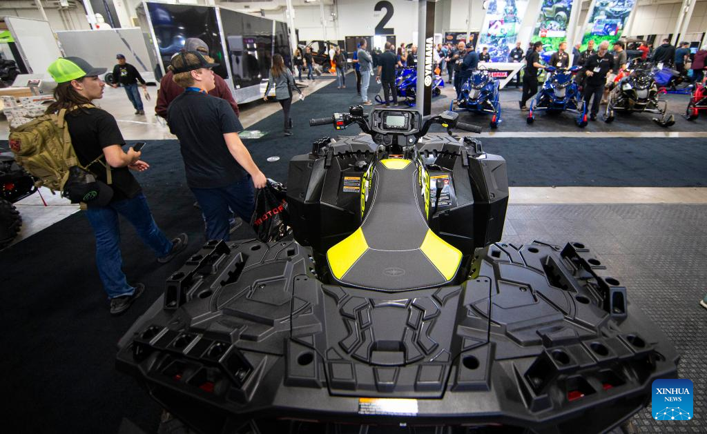 People walk past an all-terrain vehicle during the 2022 Toronto International Snowmobile, ATV &Powersports Show in Mississauga, the Greater Toronto Area, Canada, on Oct. 21, 2022. Showcasing hundreds of snowmobiles and all-terrain vehicles from major manufacturers across the world, the annual three-day show is scheduled to be held here from Friday to Sunday. (Photo by Zou Zheng/Xinhua)