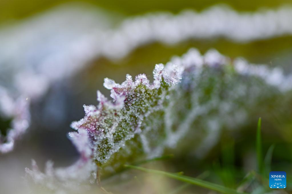 This photo taken on Oct. 16, 2022 shows hoarfrost on a plant in Shangri-La, Deqen Tibetan Autonomous Prefecture, southwest China's Yunnan Province. First Frost, also known as Shuangjiang, is one of the 24 solar terms of the Chinese lunar calendar and will fall on Oct. 23 this year. (Photo by Yu Fuquan/Xinhua)