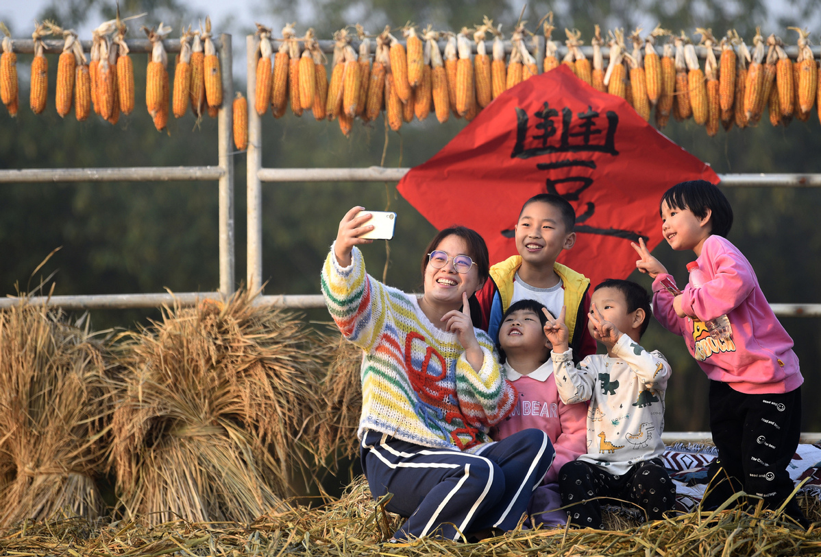 People pose for a photo at a paddy scenic spot in Huangfu village, Chang'an district of Xi'an city, Northwest China's Shaanxi province, Oct 21, 2022. [Photo/Xinhua]