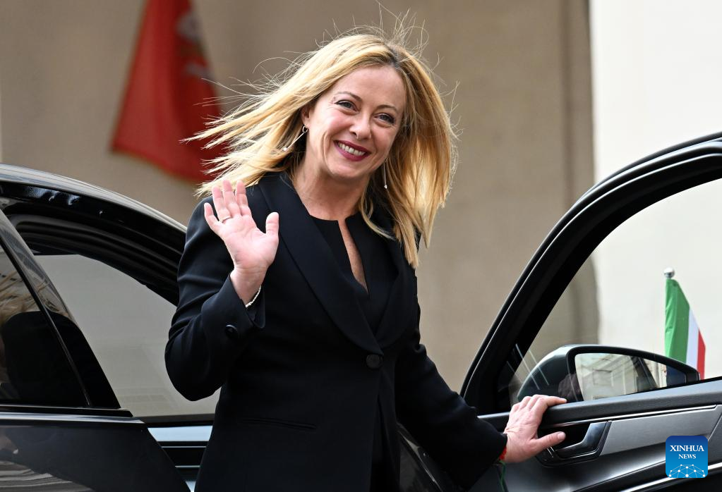 Italy's newly appointed Prime Minister Giorgia Meloni prepares to leave after the swearing-in ceremony at the presidential palace in Rome, Italy, Oct. 22, 2022. (Photo by Alberto Lingria/Xinhua)