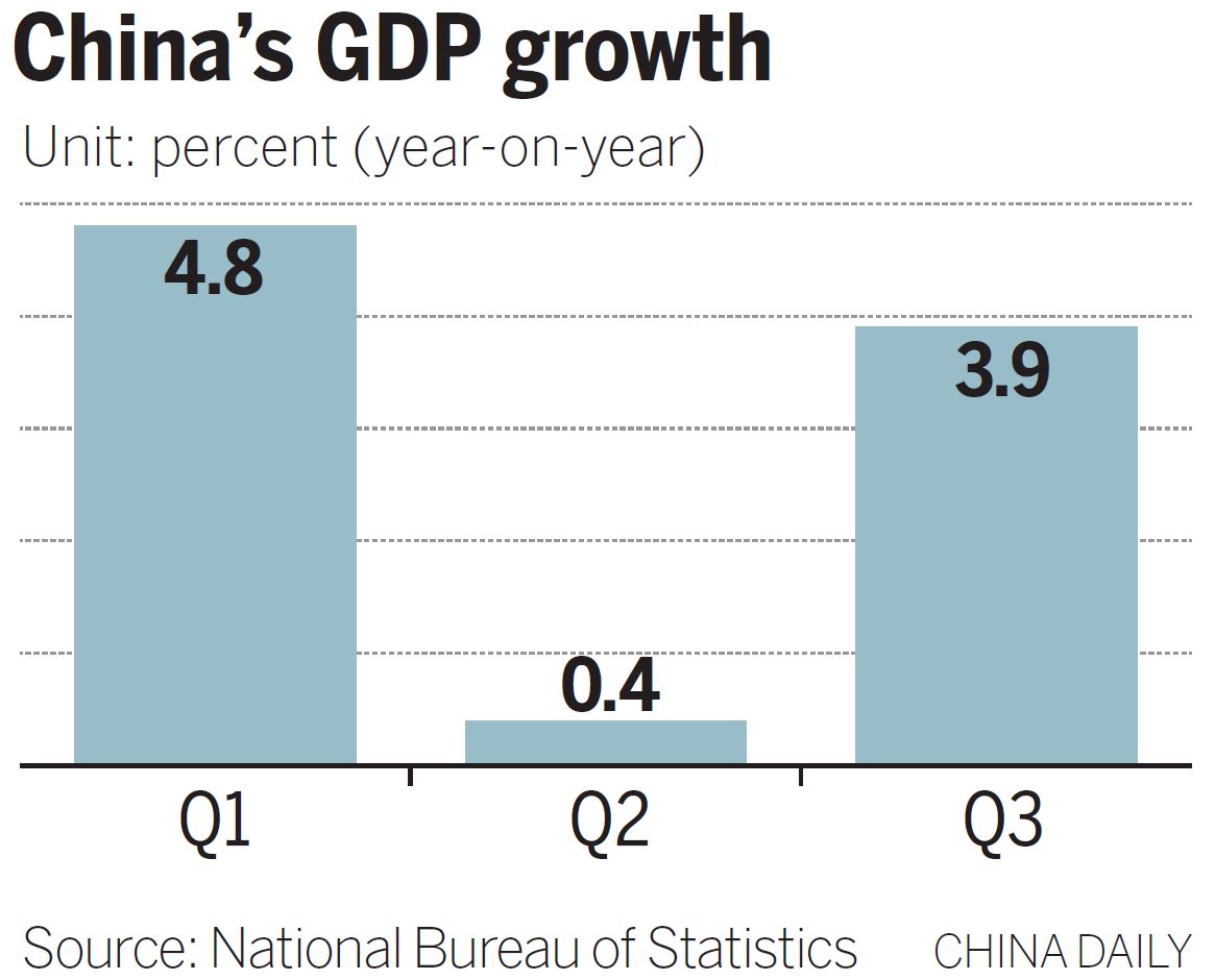 They commented after the National Bureau of Statistics said on Monday that in the first three quarters, China's GDP grew by 3 percent year-on-year to 87.03 trillion yuan ($12 trillion), compared with 2.5 percent in the first half of the year, the bureau said.