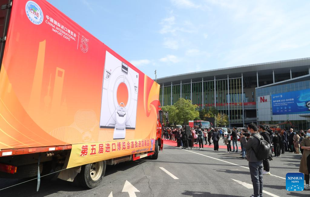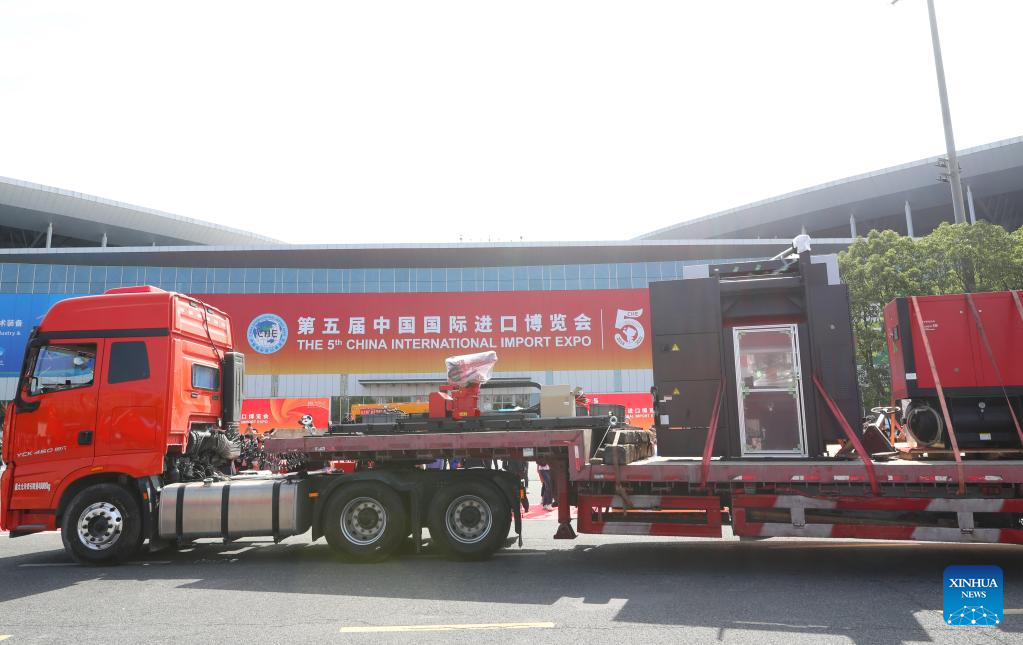 This photo taken on Oct. 24, 2022 shows a truck loaded with the first batch of exhibits arriving at the National Exhibition and Convention Center (Shanghai) in east China's Shanghai. The first batch of eight exhibits from seven exhibitors arrived at the National Exhibition and Convention Center (Shanghai), the main venue for the upcoming fifth China International Import Expo (CIIE), on Monday. (Xinhua/Fang Zhe)