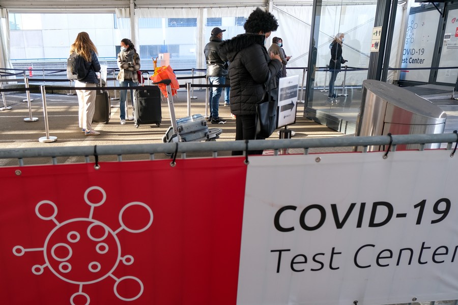 People wait to receive test at a COVID-19 test center in Brussels, Belgium, Dec. 7, 2021. (Xinhua/Zhang Cheng)