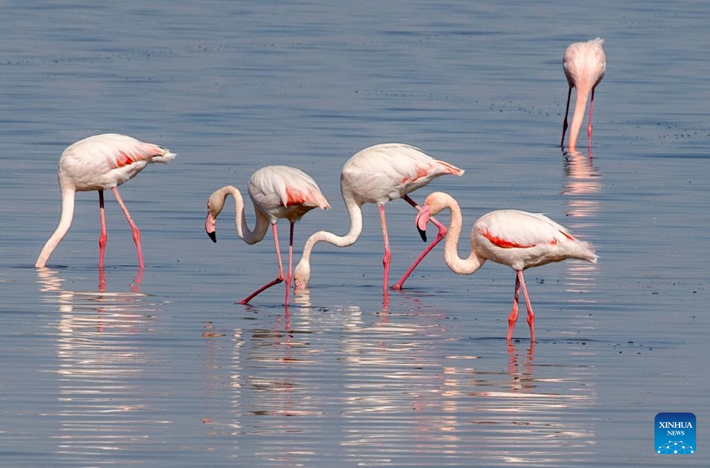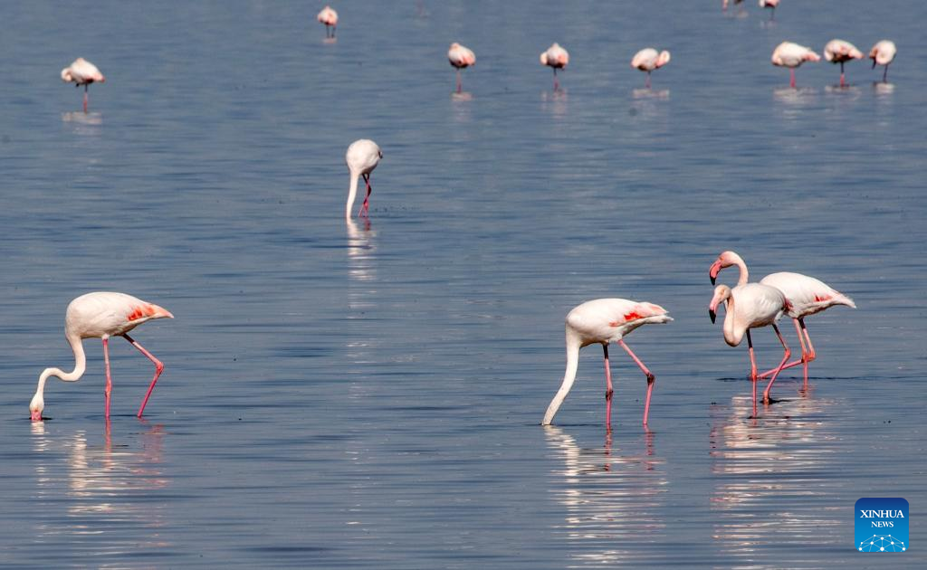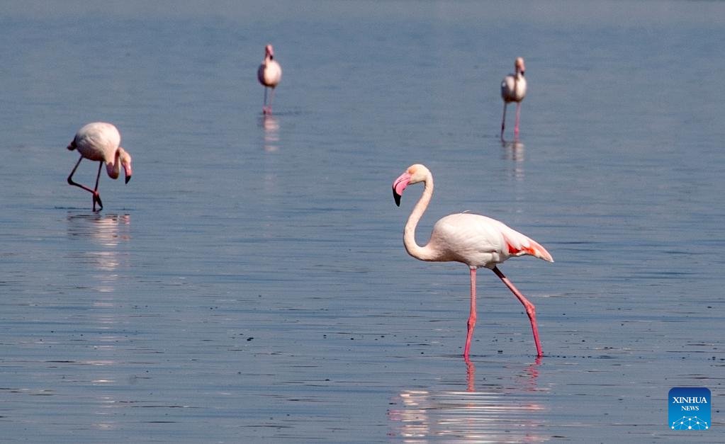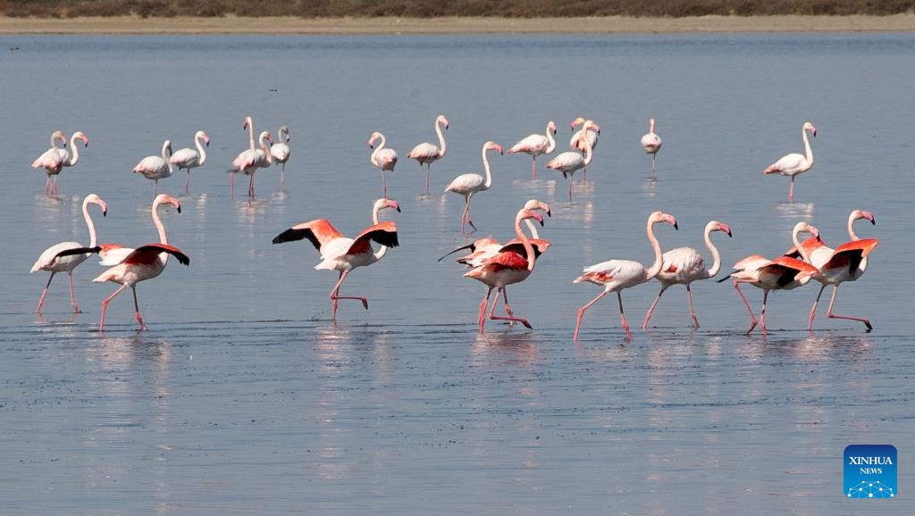 Flamingos are seen in Larnaca Salt Lake, Cyprus, Oct. 24, 2022. (Photo by George Christophorou/Xinhua)