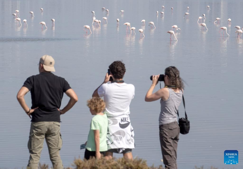People watch flamingos by Larnaca Salt Lake, Cyprus, Oct. 24, 2022. (Photo by George Christophorou/Xinhua)