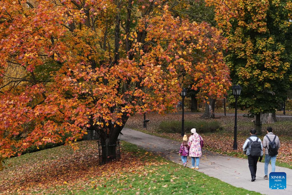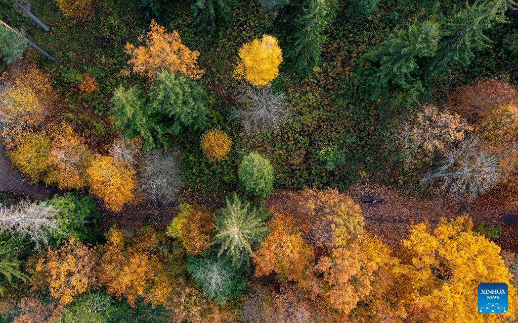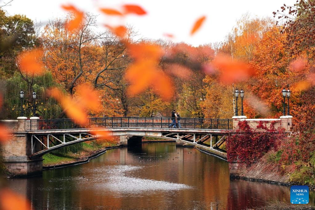 People enjoy the autumn scenery in Riga, Latvia, Oct. 24, 2022. (Photo by Edijs Palens/Xinhua)