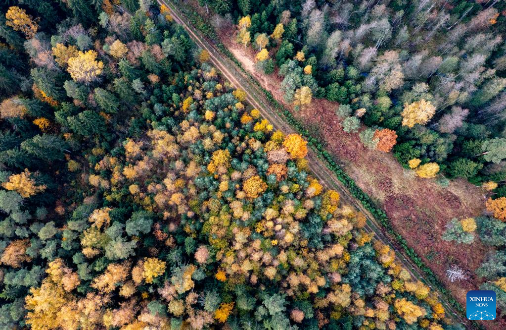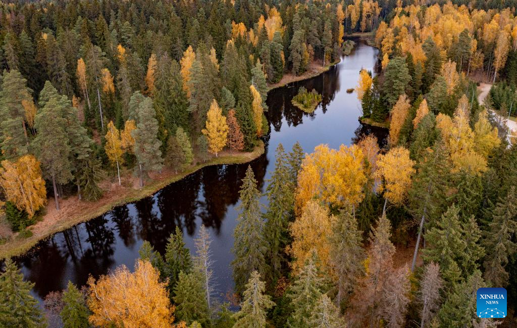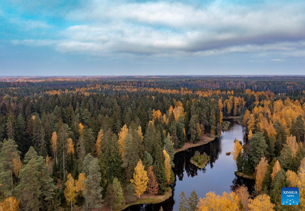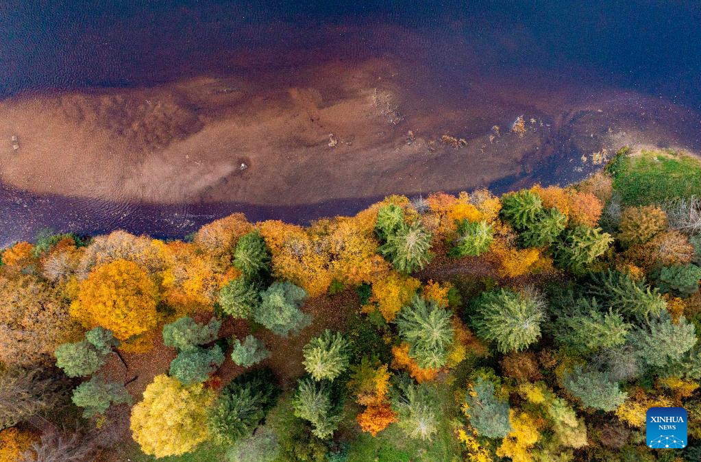 This aerial photo taken on Oct. 14, 2022 shows the autumn scenery in Ogre, Latvia. (Photo by Edijs Palens/Xinhua)