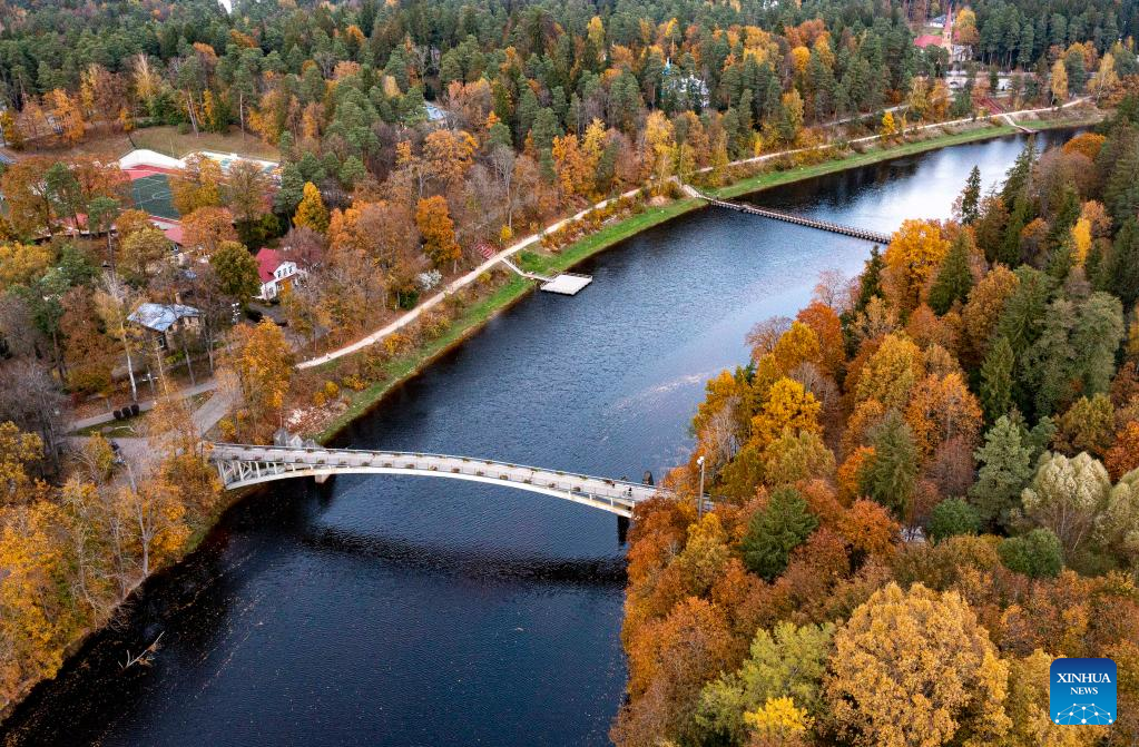 This aerial photo taken on Oct. 15, 2022 shows the autumn scenery in Ogre, Latvia. (Photo by Edijs Palens/Xinhua)