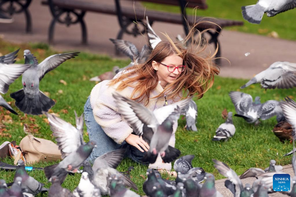 A girl feeds pigeons in a park in Riga, Latvia, Oct. 24, 2022. (Photo by Edijs Palens/Xinhua)
