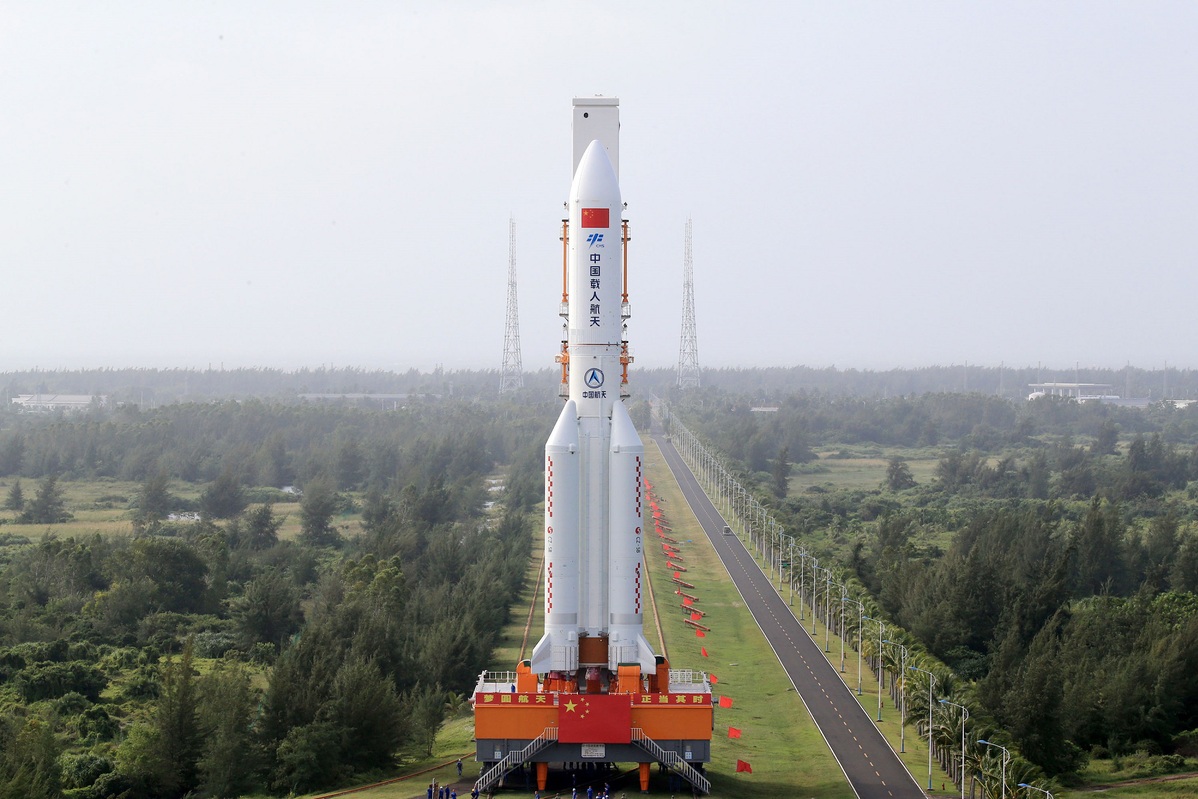 A photo shows China's Mengtian space lab module and its carrier, a Long March 5B rocket, being transported to a service tower at the Wenchang Space Launch Center in Hainan province, Oct 25, 2022. [Photo by Tu Haichao/For chinadaily.com.cn]