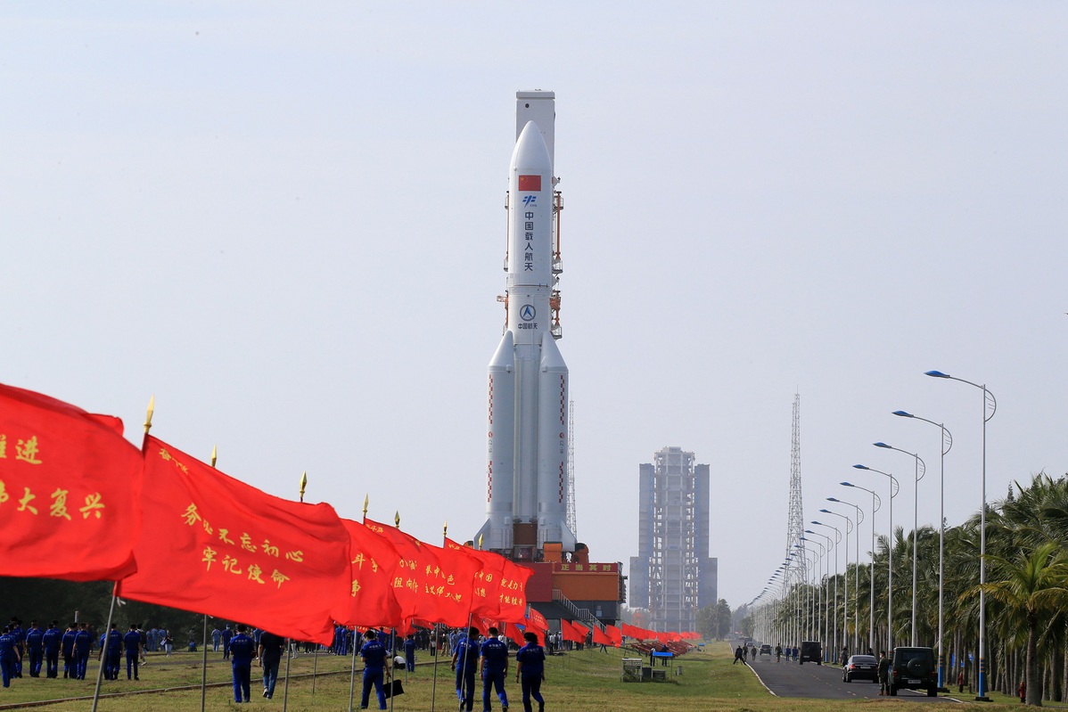 A photo shows China's Mengtian space lab module and its carrier, a Long March 5B rocket, being transported to a service tower at the Wenchang Space Launch Center in Hainan province, Oct 25, 2022. [Photo by Tu Haichao/For chinadaily.com.cn]
