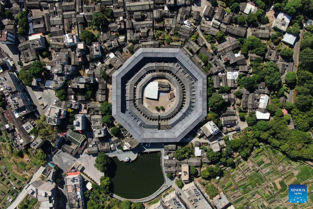 This aerial photo taken on Oct. 21, 2022 shows Daoyun Lou, an octagonal Tulou earthen building compound in Raoping County of Chaozhou, south China's Guangdong Province.