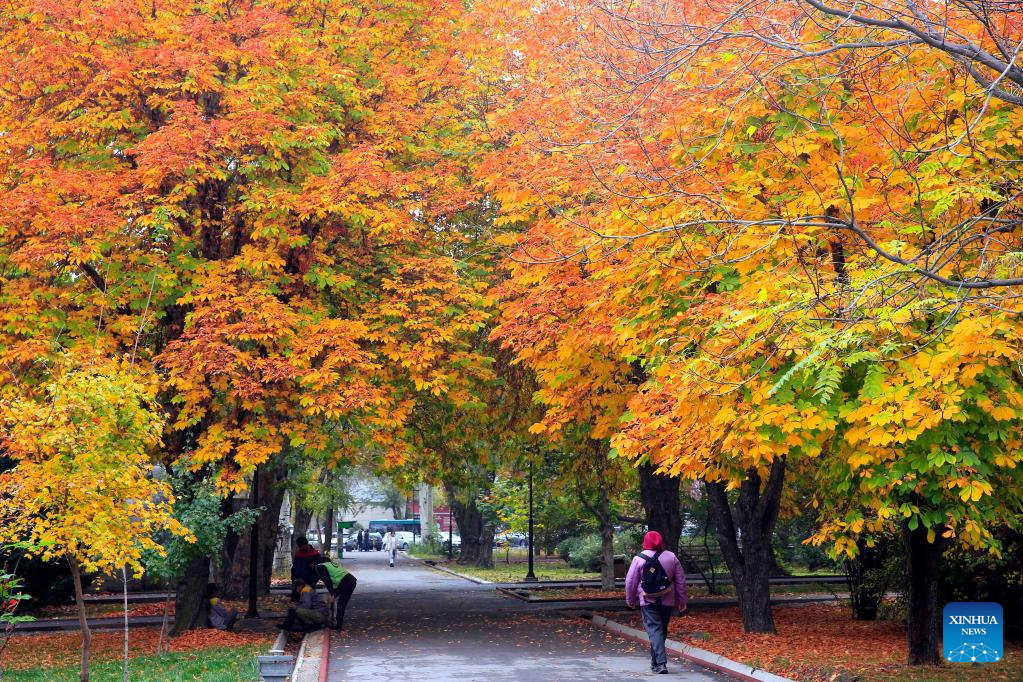 The autumn scenery is pictured at the Oak Park in Bishkek, Kyrgyzstan, Oct. 24, 2022. (Photo by Roman/Xinhua)