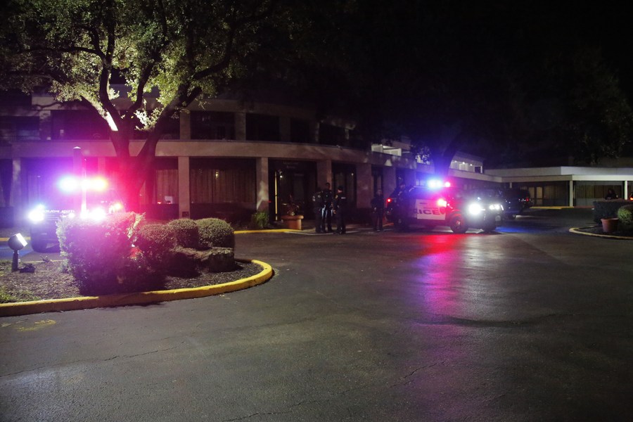 Police cars are seen outside a reunification center set up for missing attendees of the Astroworld music festival in Houston, Texas, the United States, Nov. 6, 2021. (Photo by Lao Chengyue/Xinhua)