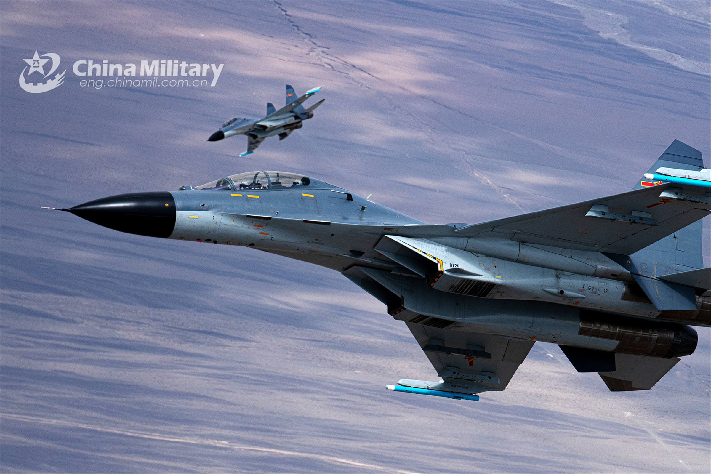 Fighter jets attached to the PLA Air Force adjust their flying formation in responding to the ever-changing circumstances during a flight training exercise. (eng.chinamil.com.cn/Photo by Yu Hongchun)