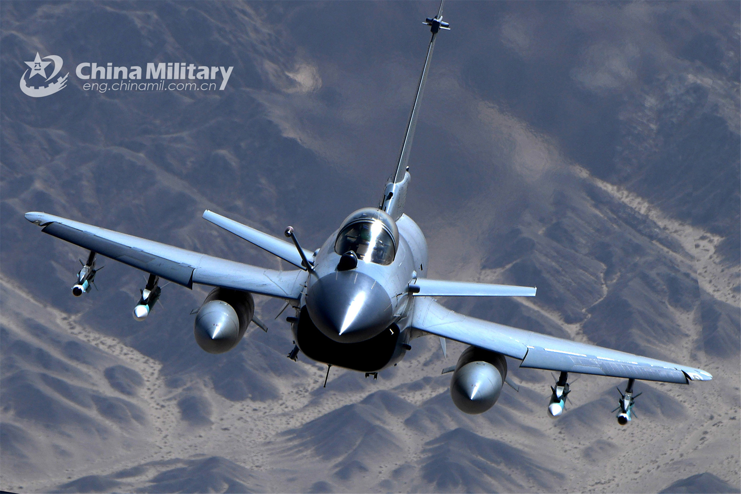 A J-10 fighter jet attached to the PLA Air Force flies over mountains during a flight training exercise. (eng.chinamil.com.cn/Photo by Yu Hongchun)