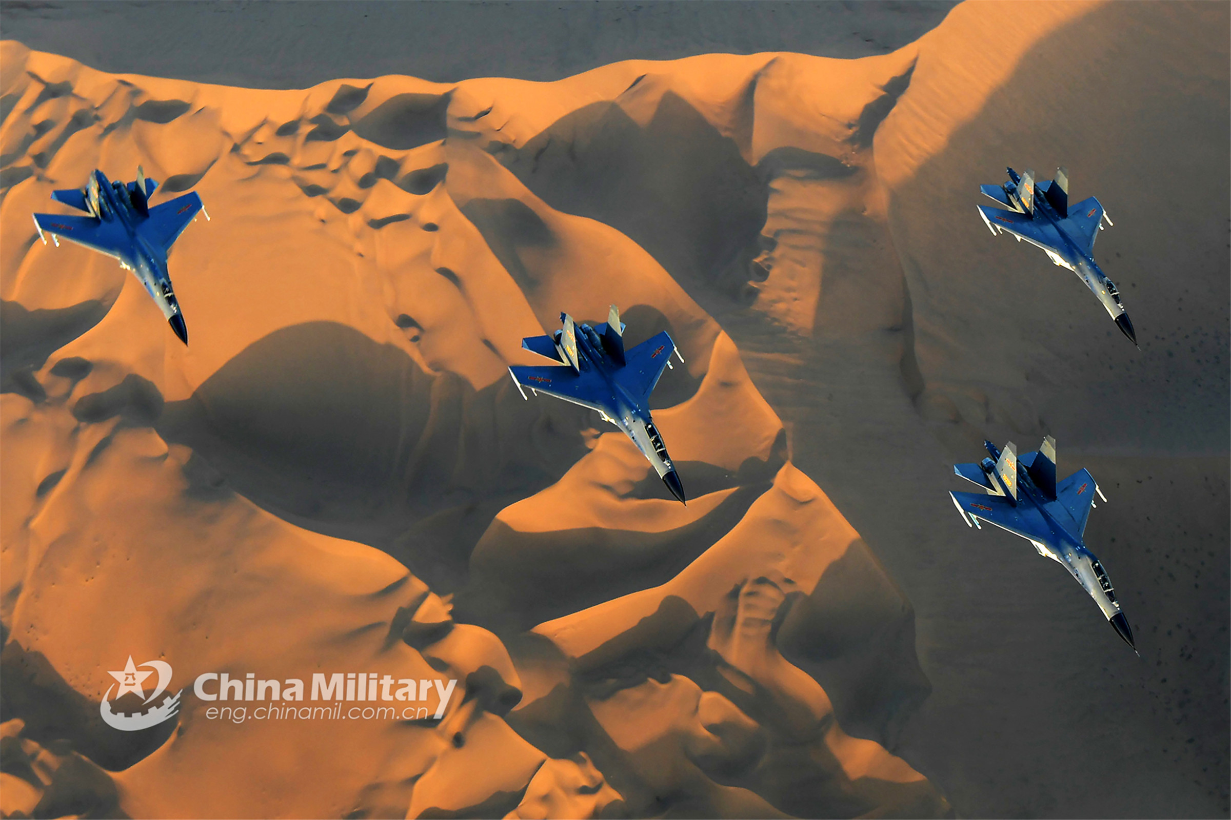 Fighter jets attached to the PLA Air Force fly in Vic-formation across the desert during a flight training exercise. (eng.chinamil.com.cn/Photo by Yu Hongchun)