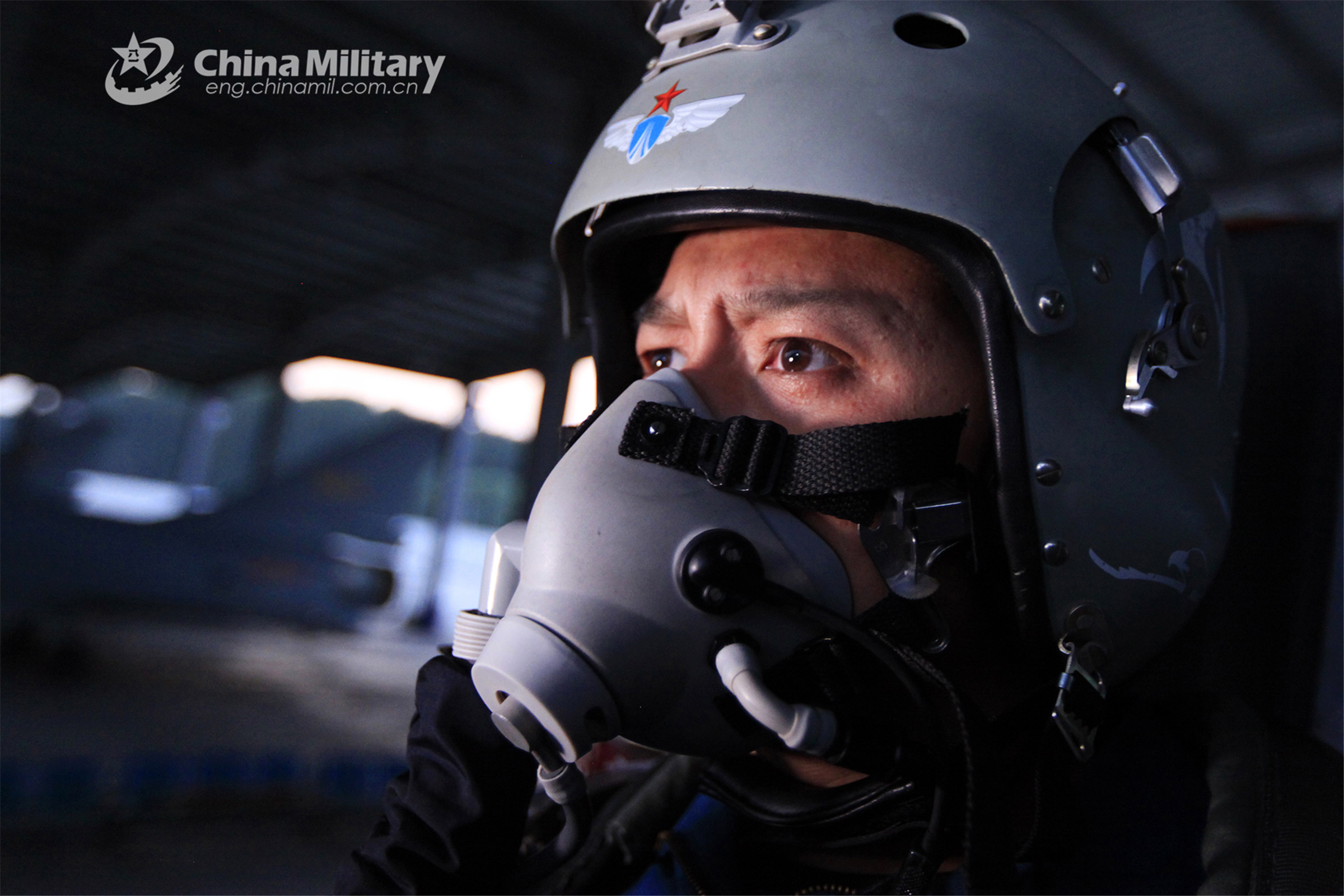 Observing the flight environment with sharp eyes, an air force pilot is ready to take off after adjusting his oxygen mask. (eng.chinamil.com.cn/Photo by Lu Bingguang)