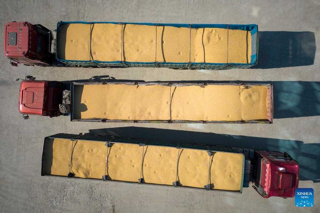 This aerial photo taken on Oct. 25, 2022 shows some trucks loaded with newly harvested soybeans at a grain trading company in Suihua of northeast China's Heilongjiang Province. Heilongjiang, a significant grain-producing province in China, has recorded a bountiful soybean harvest recently. (Xinhua/Zhang Tao)