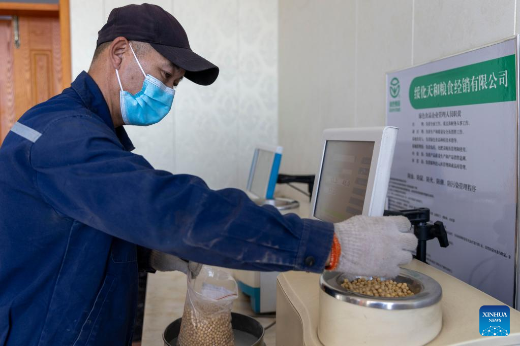 A staff member performs quality testing on newly harvested soybeans at a grain trading company in Suihua of northeast China's Heilongjiang Province, Oct. 25, 2022. Heilongjiang, a significant grain-producing province in China, has recorded a bountiful soybean harvest recently. (Xinhua/Zhang Tao)