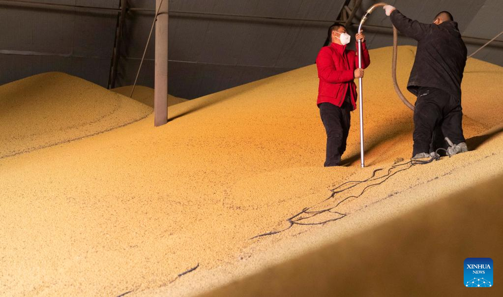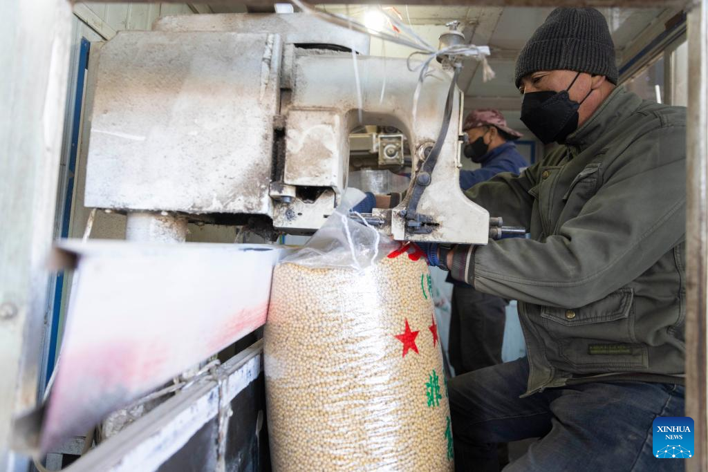 Staff members pack newly harvested soybeans at a grain trading company in Suihua of northeast China's Heilongjiang Province, Oct. 25, 2022. Heilongjiang, a significant grain-producing province in China, has recorded a bountiful soybean harvest recently. (Xinhua/Zhang Tao)
