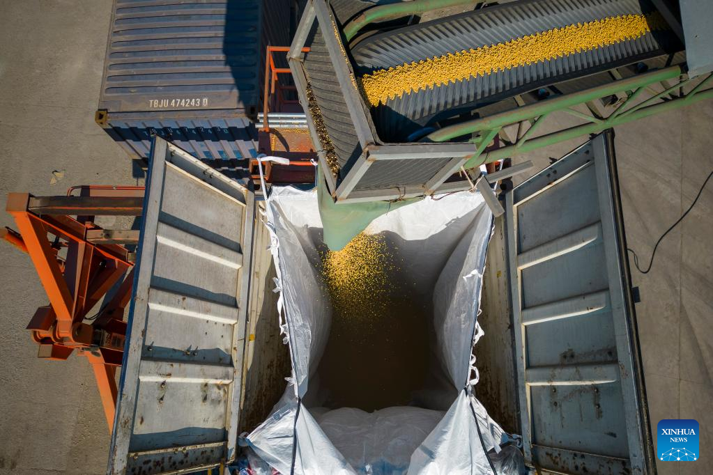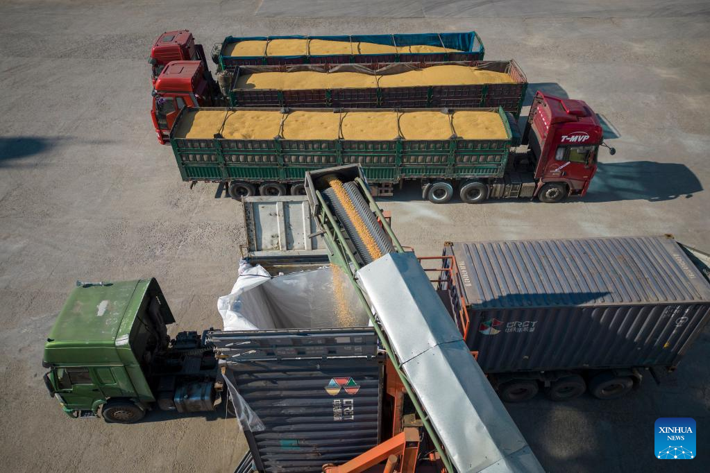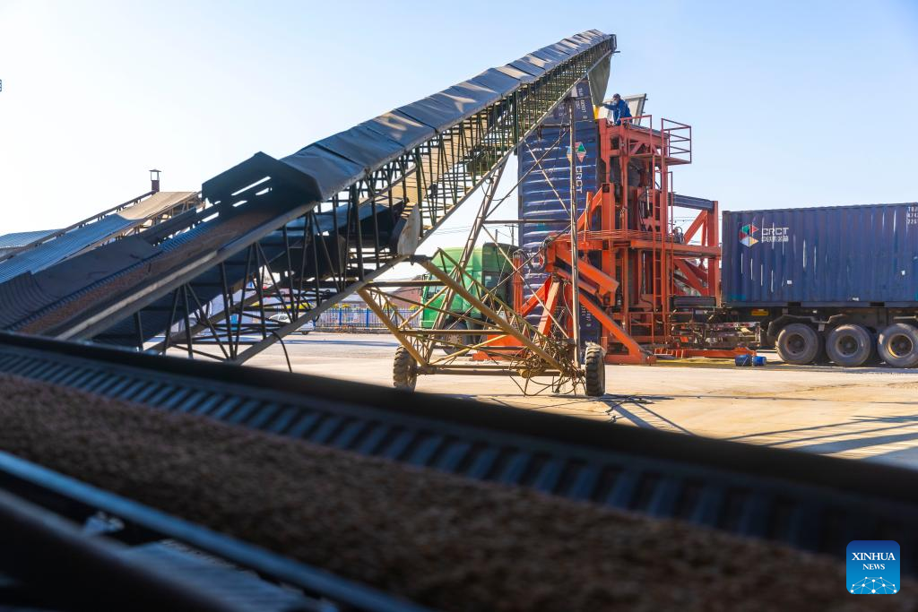 Newly harvested soybeans are loaded into a railway container at a grain trading company in Suihua of northeast China's Heilongjiang Province, Oct. 25, 2022. Heilongjiang, a significant grain-producing province in China, has recorded a bountiful soybean harvest recently. (Xinhua/Zhang Tao)
