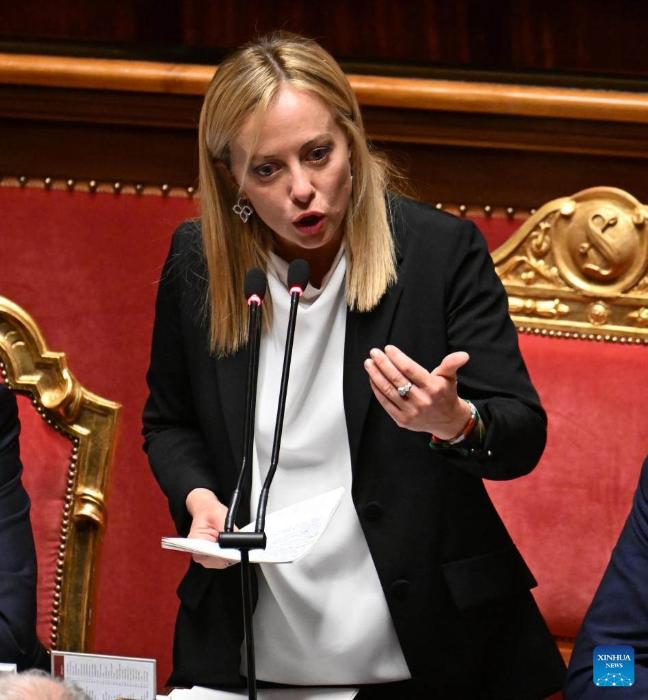 Italian Prime Minister Giorgia Meloni (C) addresses the upper house of Italy's parliament in Rome, Italy, on Oct. 26, 2022. The new Italian cabinet led by Prime Minister Giorgia Meloni won a confidence vote on Wednesday in the upper house of Italy's parliament by a comfortable margin. (Photo by Alberto Lingria/Xinhua)