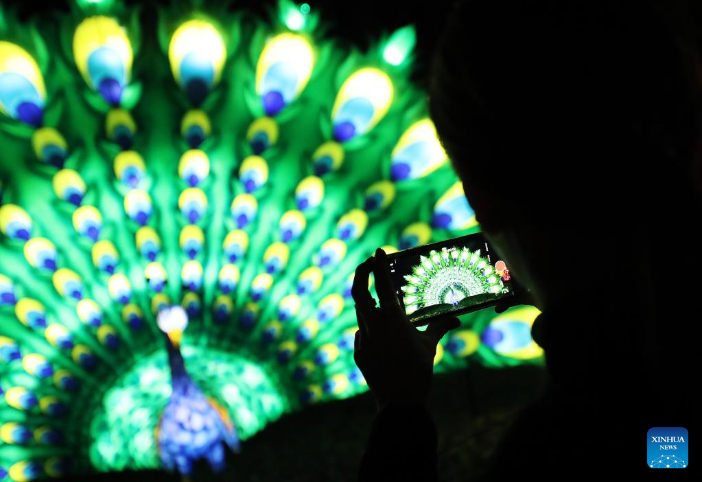 A visitor takes a photo of an illuminated sculpture during a media tour of a light festival at Thoiry zoo near Paris, France, Oct. 26, 2022. The festival will kick off here on Sunday, displaying around 2,000 illuminated sculptures. (Xinhua/Gao Jing)