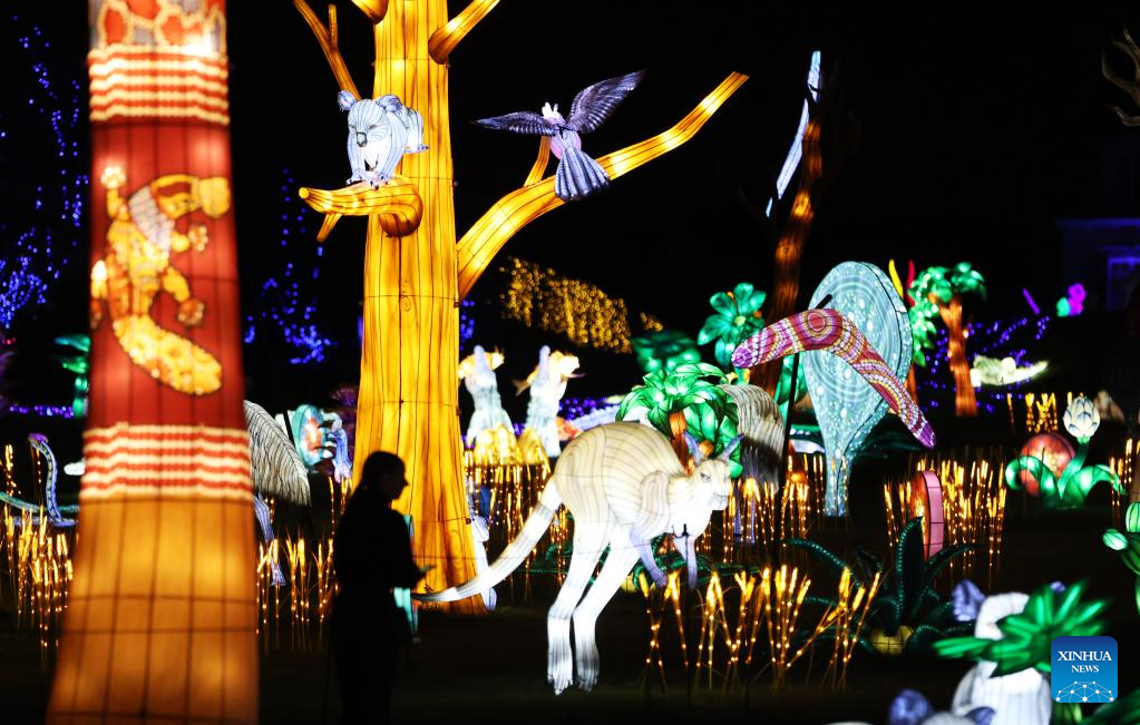 A visitor views illuminated sculptures during a media tour of a light festival at Thoiry zoo near Paris, France, Oct. 26, 2022. The festival will kick off here on Sunday, displaying around 2,000 illuminated sculptures. (Xinhua/Gao Jing)