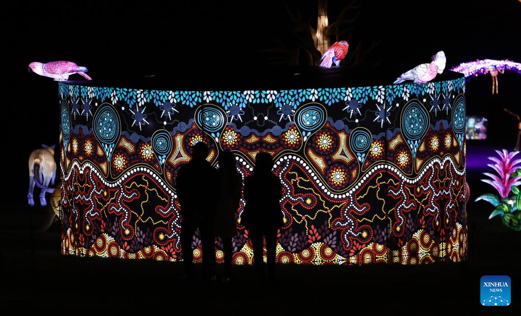 Visitors view illuminated sculptures during a media tour of a light festival at Thoiry zoo near Paris, France, Oct. 26, 2022. The festival will kick off here on Sunday, displaying around 2,000 illuminated sculptures. (Xinhua/Gao Jing)