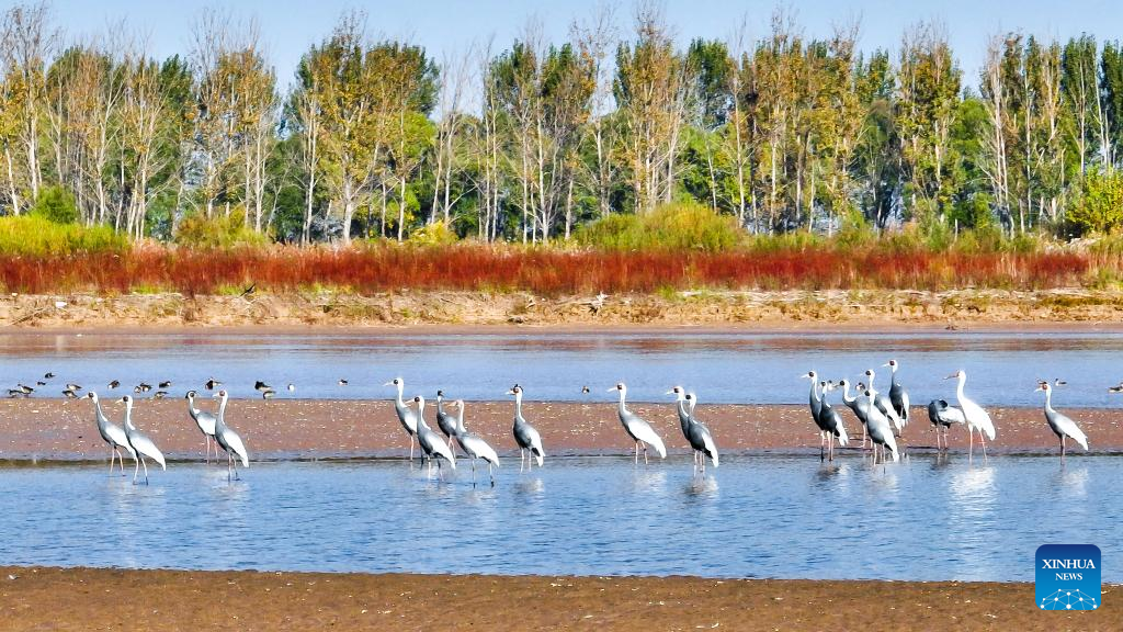 This photo taken on Oct. 18, 2022 shows white-naped cranes at the Yellow River Delta National Nature Reserve in east China's Shandong Province. The Yellow River Delta National Nature Reserve, a wetland nature reserve mainly aiming at protecting the ecosystem and rare and endangered birds at the river's estuary, was listed in 2013 on the Ramsar Convention on Wetlands of International Importance. (Photo by Yang Bin/Xinhua)