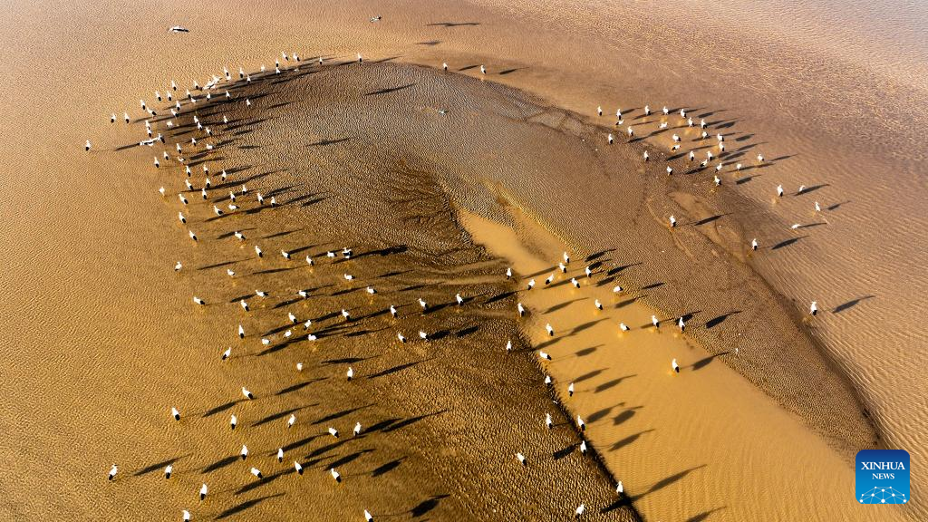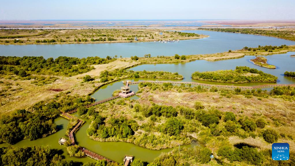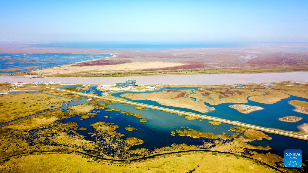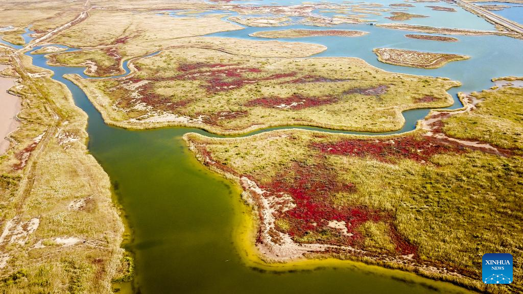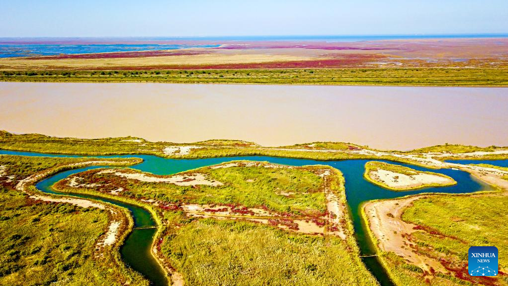 This aerial photo taken on Oct. 18, 2022 shows scenery at the Yellow River Delta National Nature Reserve in east China's Shandong Province. The Yellow River Delta National Nature Reserve, a wetland nature reserve mainly aiming at protecting the ecosystem and rare and endangered birds at the river's estuary, was listed in 2013 on the Ramsar Convention on Wetlands of International Importance. (Xinhua/Guo Xulei)
