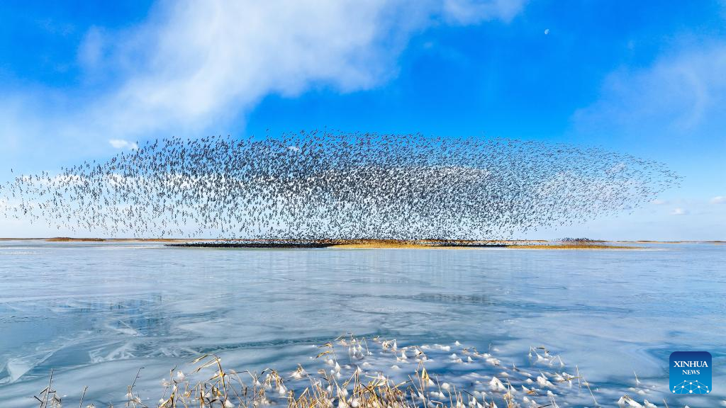 This aerial photo taken on Dec. 25, 2021 shows birds flying at the Yellow River Delta National Nature Reserve in east China's Shandong Province. The Yellow River Delta National Nature Reserve, a wetland nature reserve mainly aiming at protecting the ecosystem and rare and endangered birds at the river's estuary, was listed in 2013 on the Ramsar Convention on Wetlands of International Importance. (Photo by Yang Bin/Xinhua)