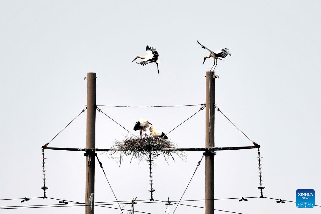 This photo taken on May 13, 2021 shows oriental white storks at the Yellow River Delta National Nature Reserve in east China's Shandong Province. The Yellow River Delta National Nature Reserve, a wetland nature reserve mainly aiming at protecting the ecosystem and rare and endangered birds at the river's estuary, was listed in 2013 on the Ramsar Convention on Wetlands of International Importance. (Xinhua/Guo Xulei)