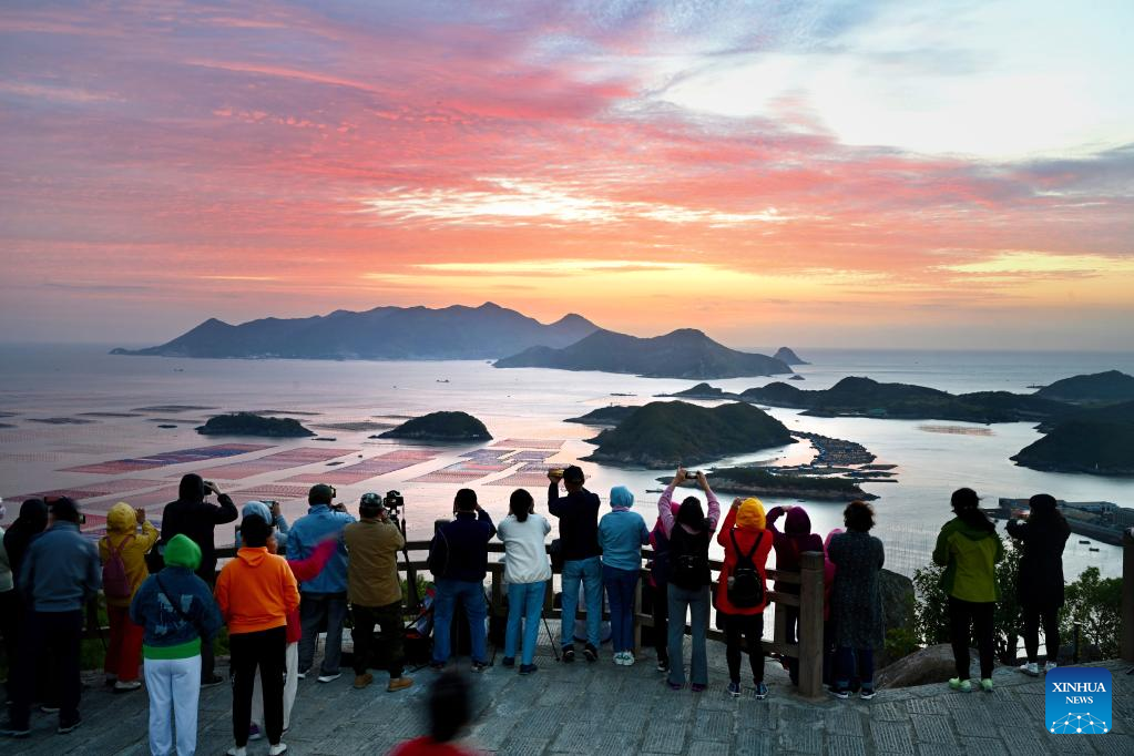 People take photos of the sunrise scenery by the seaside of Huazhu Village in Sansha Township, Xiapu County, southeast China's Fujian Province, Oct. 26, 2022. The sea area of Xiapu County has entered the peak season of autumn harvest. Boats travel through vast aquaculture area, harvesting aquatic products such as laver and oysters, from sunrise to sunset. (Xinhua/Jiang Kehong)