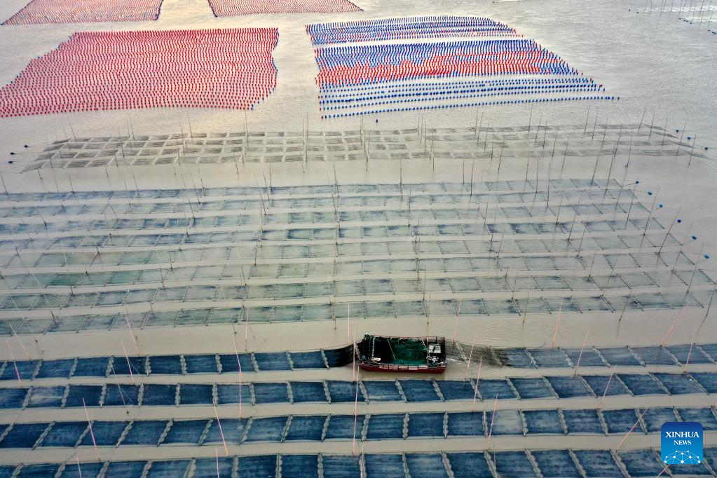 This aerial photo taken on Oct. 26, 2022 shows boats traveling in the aquaculture area of Sansha Township in the morning in Xiapu County, southeast China's Fujian Province. The sea area of Xiapu County has entered the peak season of autumn harvest. Boats travel through vast aquaculture area, harvesting aquatic products such as laver and oysters, from sunrise to sunset. (Xinhua/Jiang Kehong)