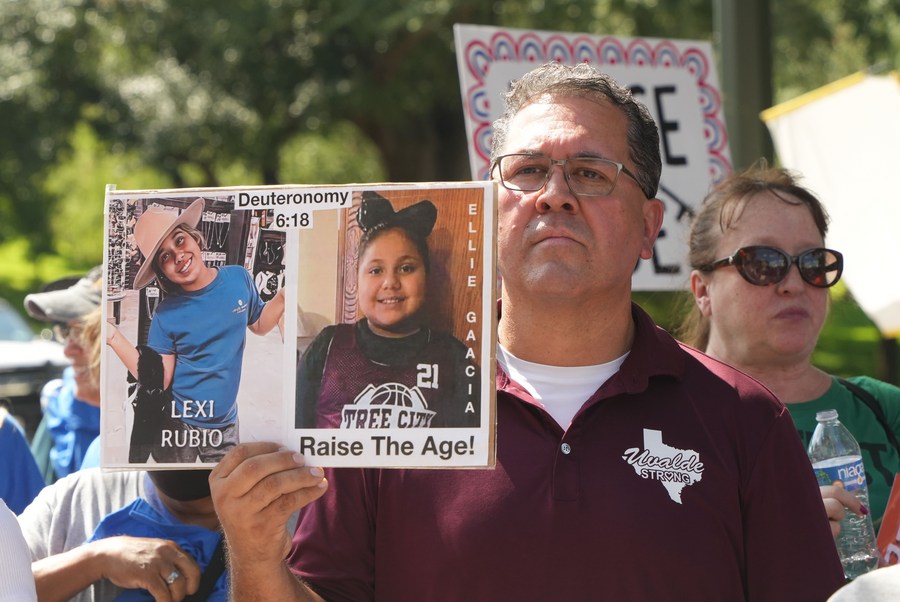 People participate in a demonstration to seek age raise for AR-15 sales in Austin, Texas, the United States, Aug. 27, 2022. (Photo by Bo Lee/Xinhua)