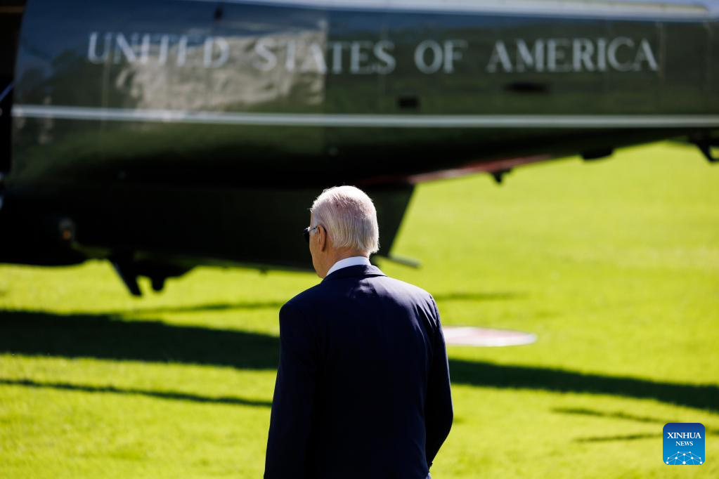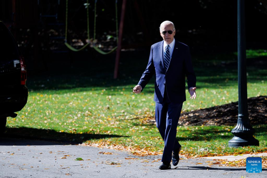 U.S. President Joe Biden walks on the South Lawn to board Marine One at the White House in Washington, D.C., the United States, on Oct. 27, 2022. Biden on Thursday marked the four-year anniversary of the attack at Pittsburgh's Tree of Life synagogue. Biden said in a statement that "we grieve this deadliest act of antisemitism in American history." (Photo by Ting Shen/Xinhua)