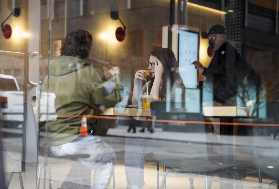 People have meals at a restaurant in New York, the United States, March 7, 2022. (Xinhua/Wang Ying)