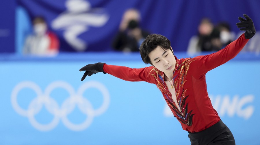 Jin Boyang of China performs the men's single free skating in Beijing 2022 Winter Olympics at Capital Indoor Stadium, Feb. 10, 2022. (Xinhua/Lan Hongguang)