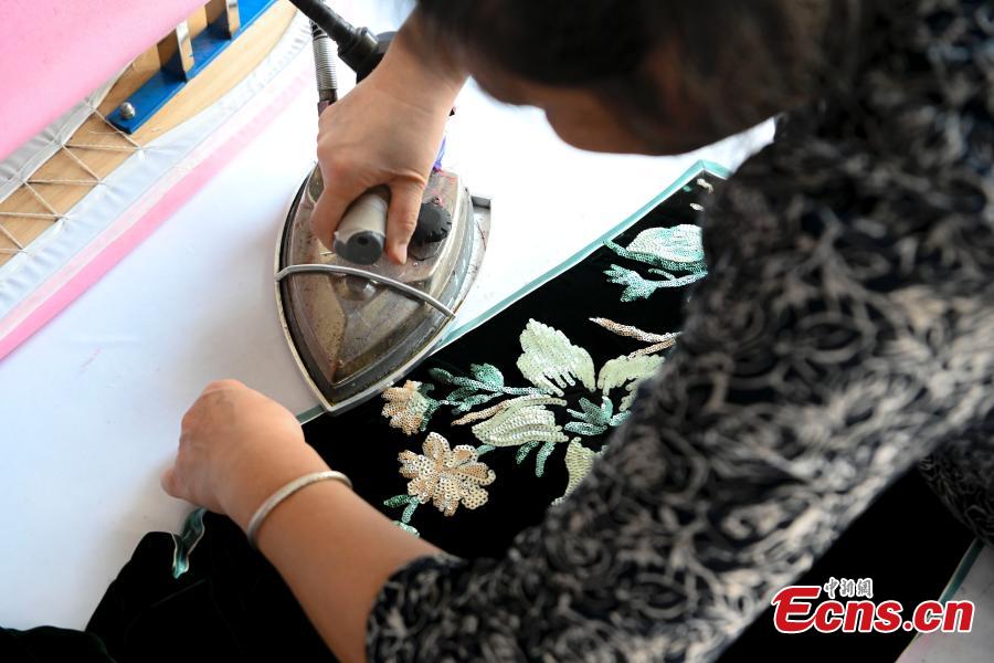 Tailor Wong works on a Longfeng Gua at her studio in Shunde, south China's Guangdong Province. (Photo: China News Service/Chen Jimin)