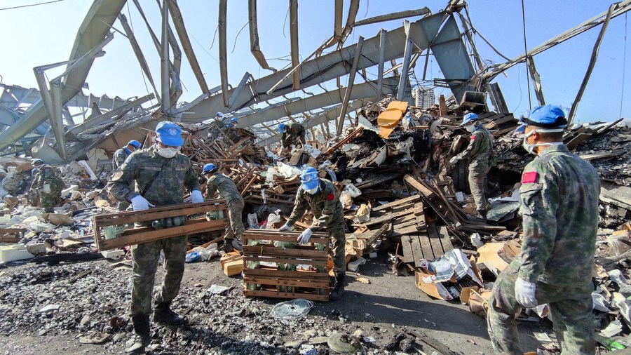 Chinese peacekeepers clear the ruins of the port explosions in Beirut, Lebanon, Sept. 30, 2020. (Photo by Zhao Wenhuan/Xinhua)
