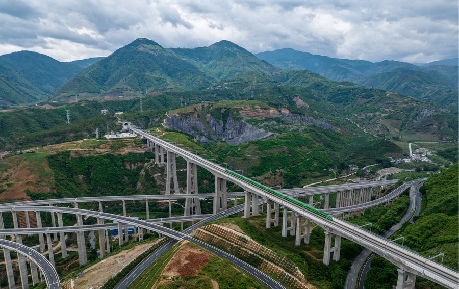 Aerial photo shows a Fuxing bullet train running through Nanxihe grand bridge on the China-Laos Railway in southwest China's Yunnan Province, June 2, 2022. (Xinhua/Jiang Wenyao)