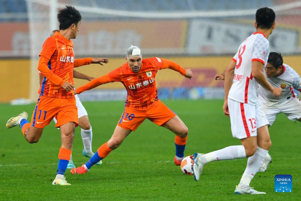 Moises (C) of Shandong Taishan competes during a 2022 season Chinese Football Association Super League (CSL) match against Shanghai Port in Jinan, capital of east China's Shandong Province, Oct. 30, 2022. (Xinhua/Zhu Zheng)