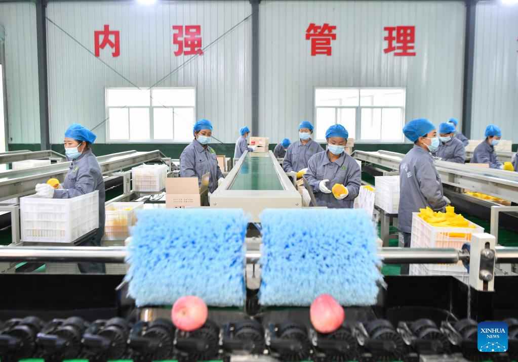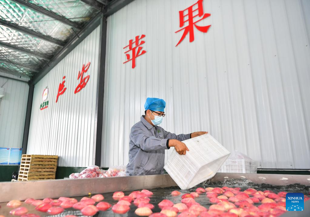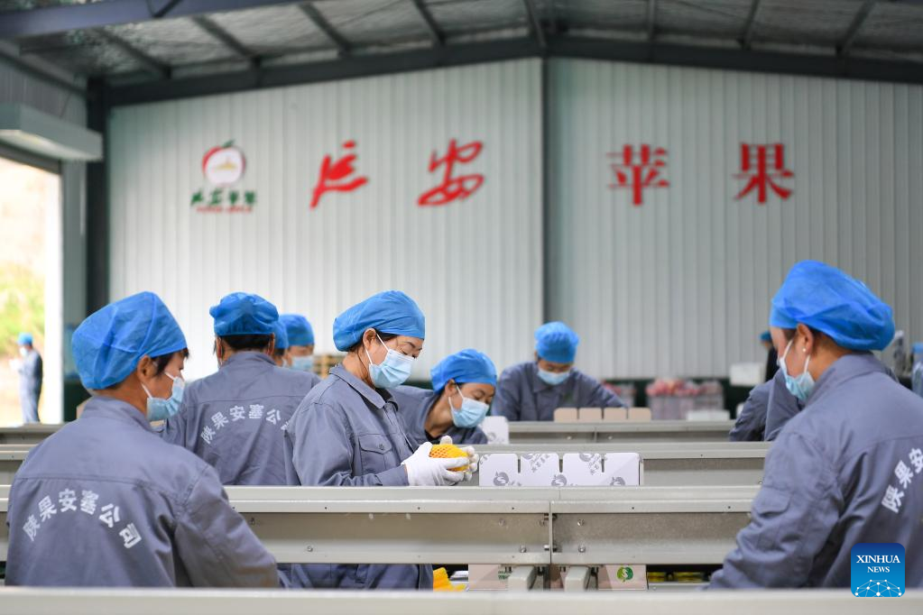Staff members package apples at an apple sorting and packaging workshop in Nangou Village of Yan'an, northwest China's Shaanxi Province, Oct. 27, 2022. Covering an area of 24 square kilometers, the Nangou Village is home to more than 1,000 villagers. Led by the village's Party branch, Nangou has worked out ways to inject vitality into the countryside. It has witnessed the boom of planting and breeding industries and rural tourism. Villagers have constantly increased their income by earning dividends and taking odd jobs during the slack farming season. (Xinhua/Zhang Bowen)
