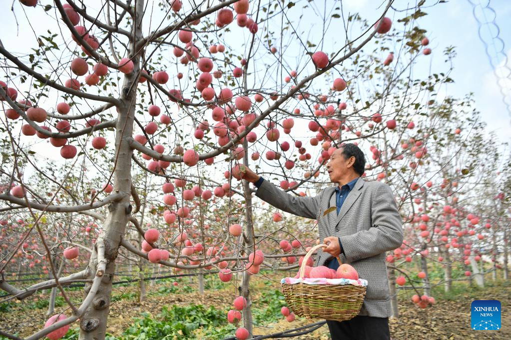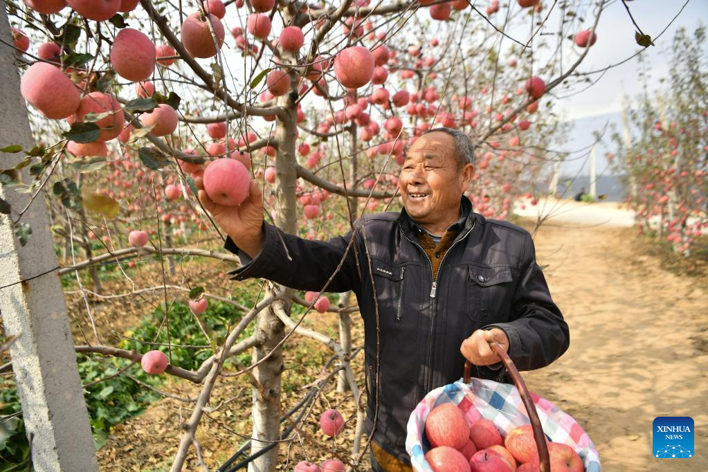 A fruit farmer picks apples in an orchard in Nangou Village of Yan'an, northwest China's Shaanxi Province, Oct. 27, 2022. Covering an area of 24 square kilometers, the Nangou Village is home to more than 1,000 villagers. Led by the village's Party branch, Nangou has worked out ways to inject vitality into the countryside. It has witnessed the boom of planting and breeding industries and rural tourism. Villagers have constantly increased their income by earning dividends and taking odd jobs during the slack farming season. (Xinhua/Zhang Bowen)